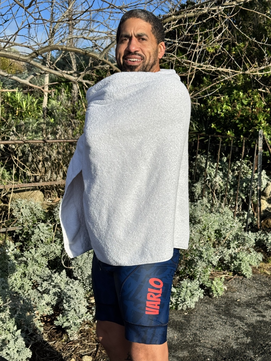 After finding an open spot, I removed my cold-weather layers and, wearing only triathlon shorts, walked barefoot to the dock. Once I reached the ladder, I looked up at Robin and Kai and, without hesitation, climbed down into the water. As expected, the water was shockingly cold. I dipped my head underwater to fully embrace the plunge and immediately swam to the boat ramp to get out. My skin tingled, and my heart raced as I gasped to catch my breath.